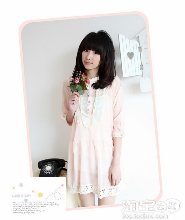 拥有蕾丝花边装饰的粉色雪纺连衣裙,带出华丽而甜美的气息。