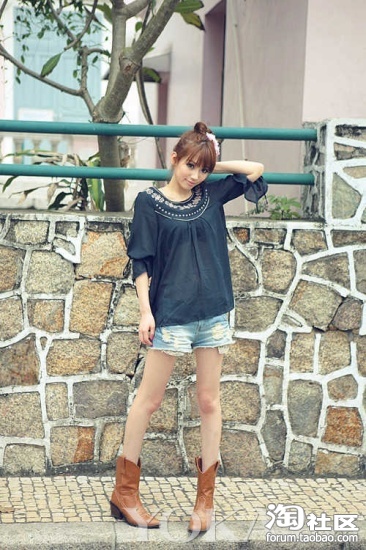 藏蓝色的雪纺小衫带有印第安风情的花纹做帮衬很俏皮,做旧的小热裤也给人非常可人的感觉。有点羞怯,有点可爱,配上一双棕色的小牛皮短靴,放佛漫画人物般的搭配方式惹人喜爱。人喜