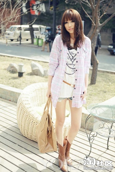 穿着你大大的衬衣,有种不和谐的美感出现于身上,轻嗅着只属于你的味道,渐渐的沉醉其中。碎边牛仔热裤让人将视线集中于修长美丽的腿部线条上,还有尖头短靴摇滚中带着亲切感。