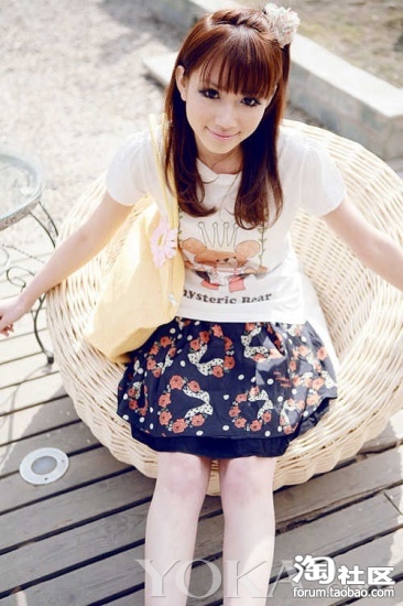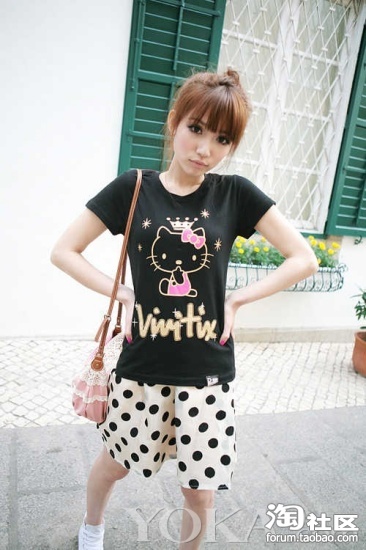 每当犯了错误,都睁着大大的眼睛,一脸无辜的看着你,你也再不忍心责备。hellokitty的小t恤,大圆点的短 裙,随意的丸子头,掐腰,嘟嘴,流行的狗狗妆,打造日系美少女风