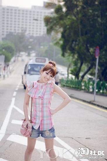 粉色系荷叶边圆领衬衫上衣的设计风格与色彩搭配都非常可爱,加上破洞牛仔短裤的破落都市风,再把头发梳起 ,绝对