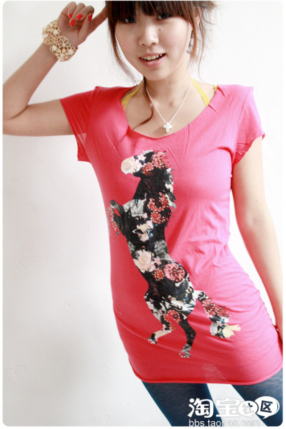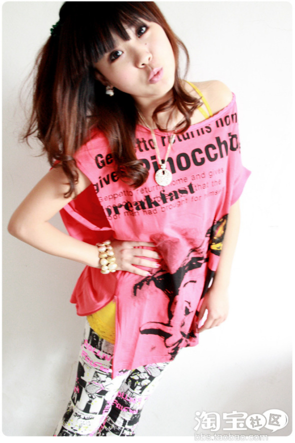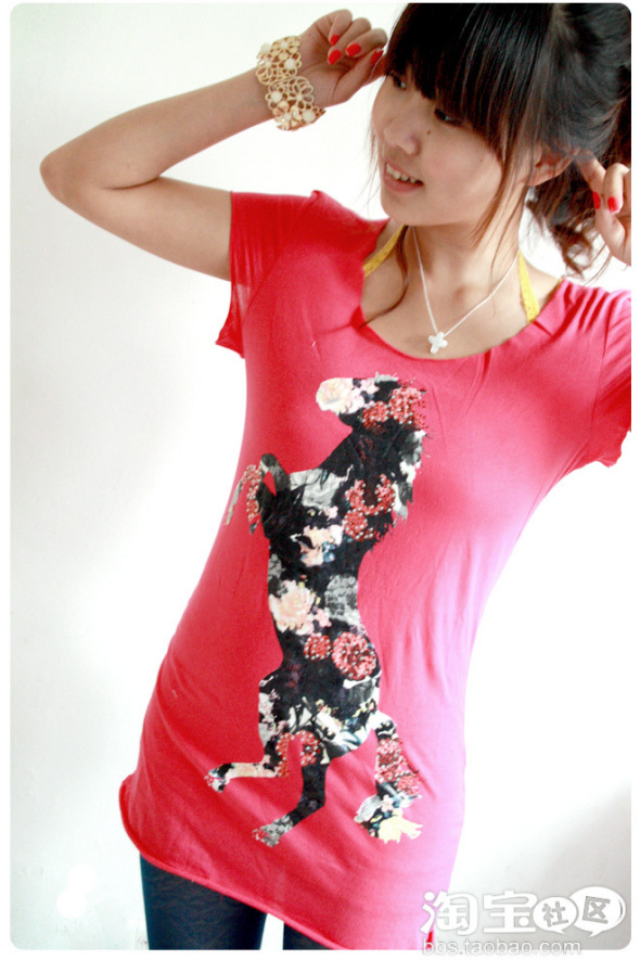 第二套:大桃心T+多彩打底裤+很多很多层的项链~~