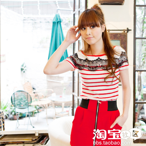 红白条纹短T+艳红色修身裙:有种淡淡的职业女生的味道哦,但主要还是凸显着女孩子的稚嫩,很艳丽的颜色,真的让人眼前一亮呢!