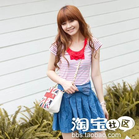 红白条纹短T+蓝色短裙:虽然简单却很有层次感,腰间的蝴蝶结腰带设计很抓人眼球哦,和T恤上的艳红色蝴蝶结遥相辉映 哦!