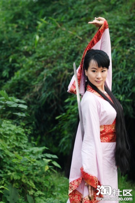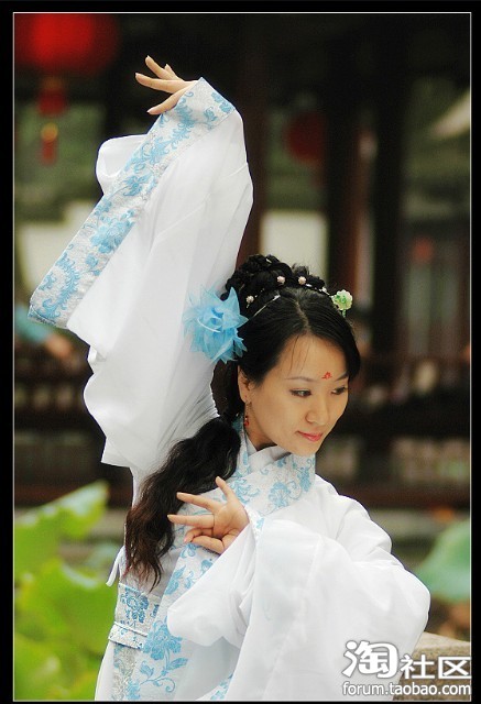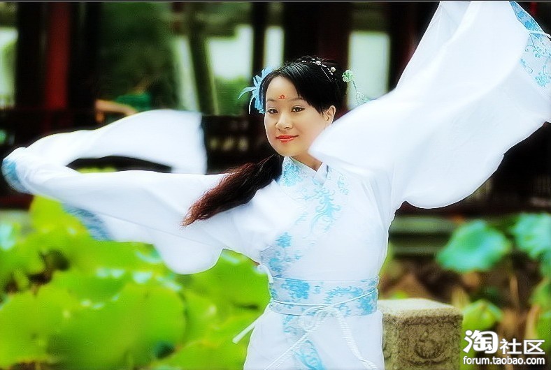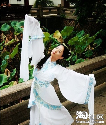 同天在西湖取景的还有这套白的,水袖可以卸下来。个人比较喜欢这套,虽然前一套在论坛的反应比较热烈。虽然这套拍的时候脚很是受罪,因为店家没有卖鞋,所以我是穿高跟鞋拍的,为了效果好,我在公园的石子路上跳了一段霓裳羽衣舞,不过出来的图我们都很满意,付出还是很值得的~