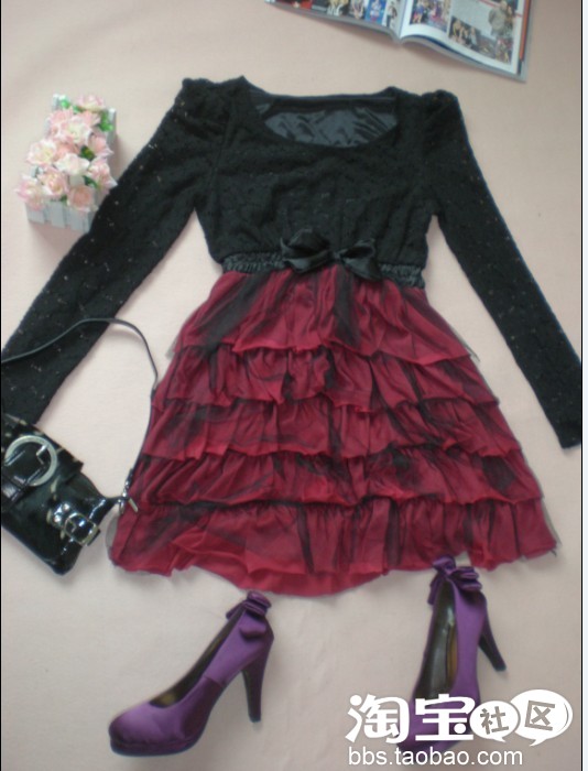下摆层层的裙摆,酒红色加上外面薄薄的黑色蕾丝罩着 低调的华丽呢。。刚好又与上半身的黑色蕾丝相互呼应。。
