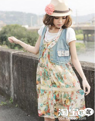 牛仔马甲 混搭 浪漫碎花连衣裙