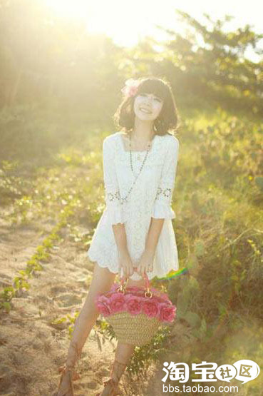 简单的白色,淡雅的蕾丝,搭配一款田园派编织包包,走在乡间的小路上,与大自然融为一体~