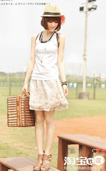 碎花裙+牛仔马甲再配上一款编织帽,绝对是今夏最in的流行装扮,清新浪漫的感觉最适合约会穿喔!