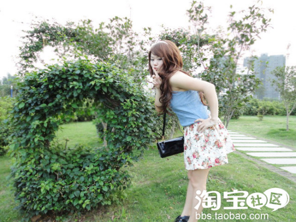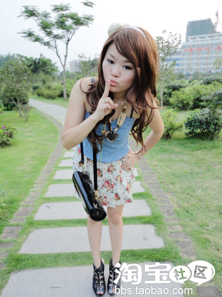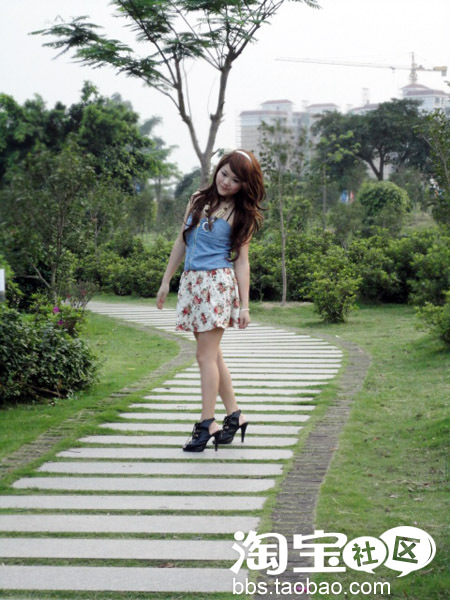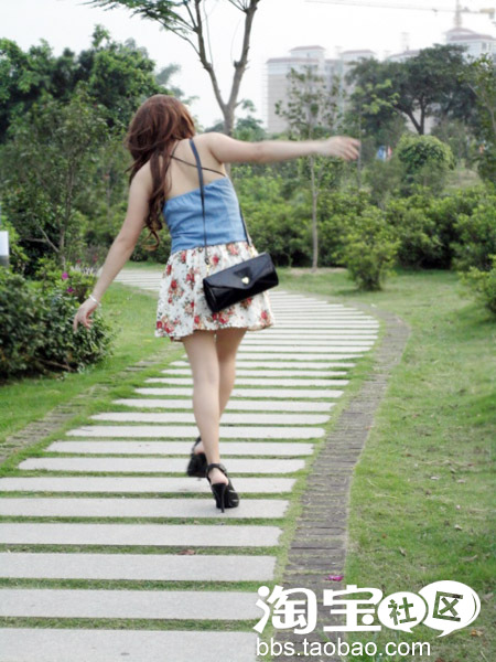 牛仔裹胸碎花裙+百搭罗马高跟鞋