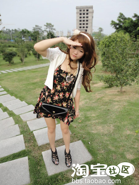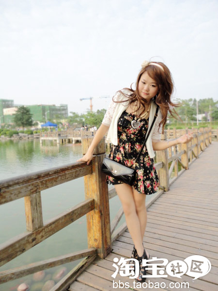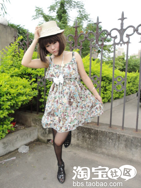 甜美女人风吊带碎花裙+蝴蝶结吊链