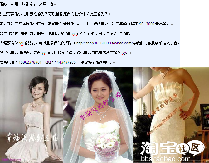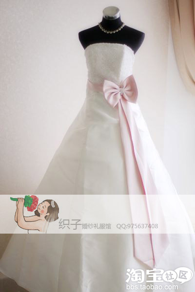 与老公相恋8年,最后,终于有了一个圆满的结局。在2008年的10月和老公步入了婚姻的殿堂。临结婚之前,去影楼试穿结婚当天的婚纱,才发现,那些让你免费穿的婚纱真是又破又烂。可是好看的,干净点的租金又很贵,一天要500多。一生最珍贵的时光当然不能留下遗憾,所以从影楼试穿婚纱回家,就打开电脑上淘宝,看看有没有好婚纱,别说,还真让我找到我满意的一件了。才200多,裙撑,手套,头纱都有。本人胸部不是很丰满,所以选的是挂脖的款,是上海的一家店。当时我妹妹在上上海上学,就让她去跟卖家当面交易了。在交易的时候,我不放心,打电话又问了一下妹妹,做工如何,质量如何,妹妹就说了三个字,挺好看的。等结婚前两天,妹妹从上海回来拿出婚纱让我亲自过目,真的很理想,不说了,上图了。