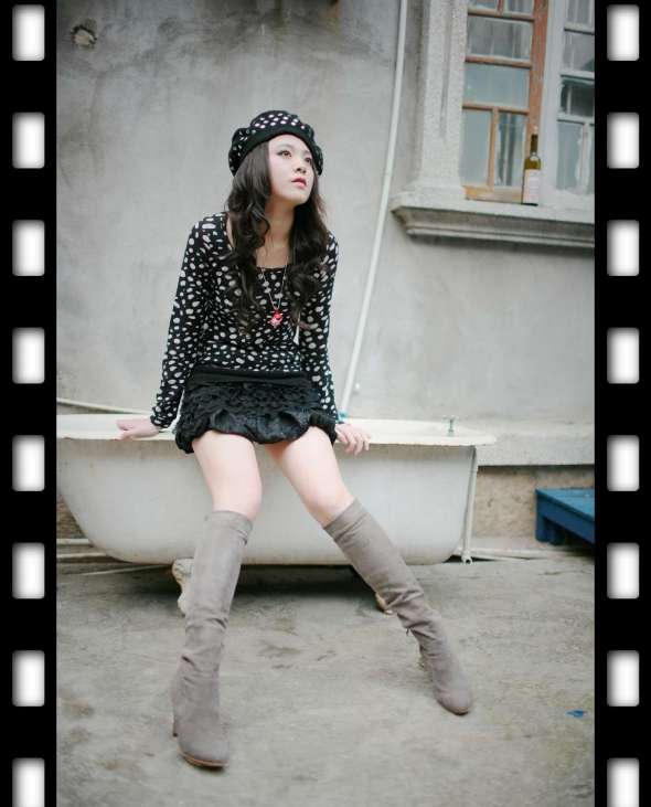 被我穿成衣服的奶牛连衣裙,呵呵,好在加了衬裙,超有气质的连衣裙+长筒靴,当然,不能少了贝雷帽哦!