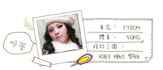 模特入行经历:参加海西(福建)帆船小姐选秀比赛获季军,其实在大学里就是活跃的模特队成员哦,上选修课的时候,被喜欢摄影的老师发现,于是开始尝试拍平面模特照,但是真正入行网拍模特,则是在09年底啦!