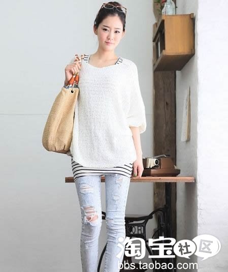 条纹背心+白色套头衫+破洞牛仔裤