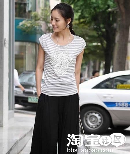 条纹T恤+黑色阔脚裤