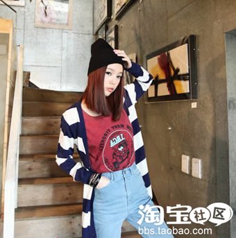 黑白相间的条纹针织开衫,搭配蓝白色高腰紧身裤,深红色印花T恤,潮范儿十足的装扮充满年轻的不羁和张扬,将海魂风经典以更加年轻潮流的姿态展现。