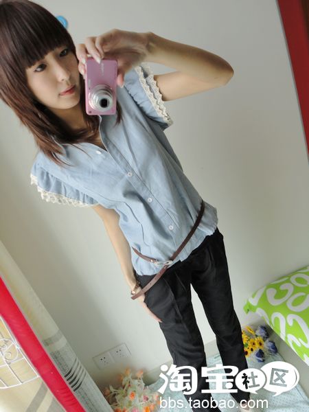 蓝色薄牛仔飞袖衬衫+腰带+黑色哈伦裤