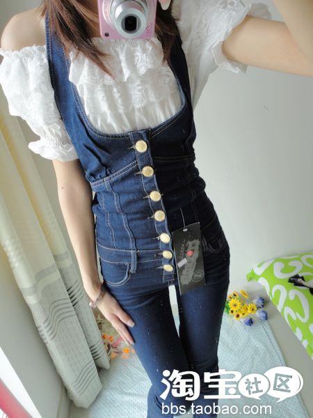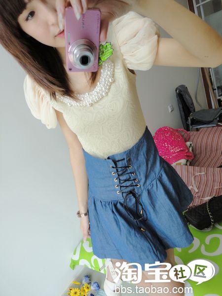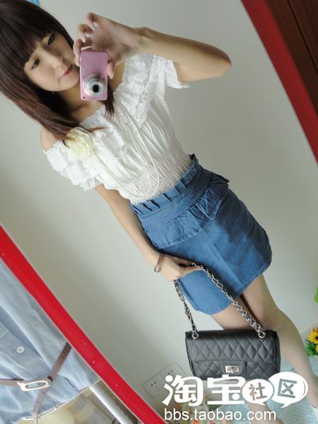 白色雪纺蕾丝一字衫+高腰牛仔A字裙
