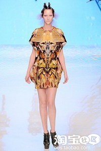 Alexander McQueen的2010春夏系列——柏拉图的亚特兰蒂斯。McQueen精心处理的海洋爬行动物印花。数码印制爬行动物图案的短裙打破了人们一贯认为动物纹样应用的法则,而古海洋怪物的装甲头部般奇形怪状的鞋子也让人大呼设计师的奇思妙想。每件裙子都是兼具计算机艺术与McQueen标志性的高级定制剪裁工艺的作品。