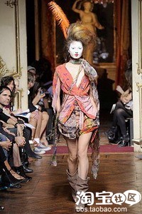 复古民族风~Vivienne Westwood那些附着在衣服上的嵌花编织工艺,以及裹身或者悬垂的裙装外古怪的廓形装饰,毫无章法的民族感印花和乖张的造型完美呼应,给人以不可言喻的视觉感受。