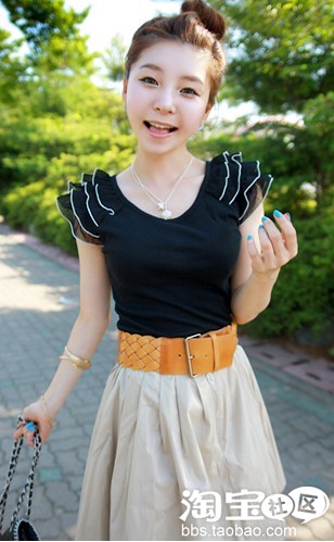黑色小T+库拉群+卡其皮带=俏皮女生