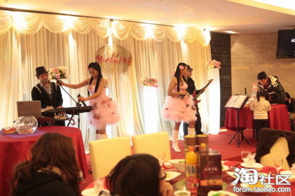 为了能让婚礼气氛不错,请来了一个四人组合的菲律宾乐队,从仪式开始前唱一些慢歌,到敬酒时候欢快的歌曲,还有许多互动,让不少人觉得这个乐队请的值.
