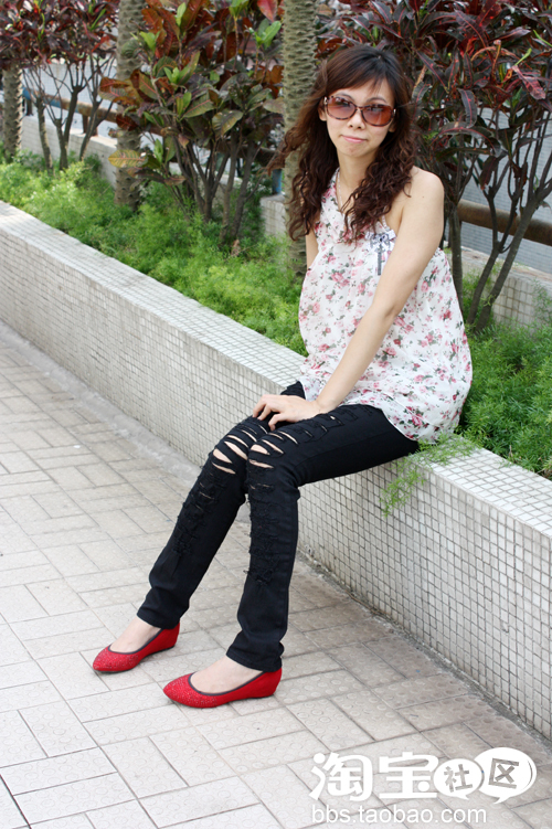 1、花朵图案挂脖双层雪纺衫+破洞牛仔裤+红鞋
