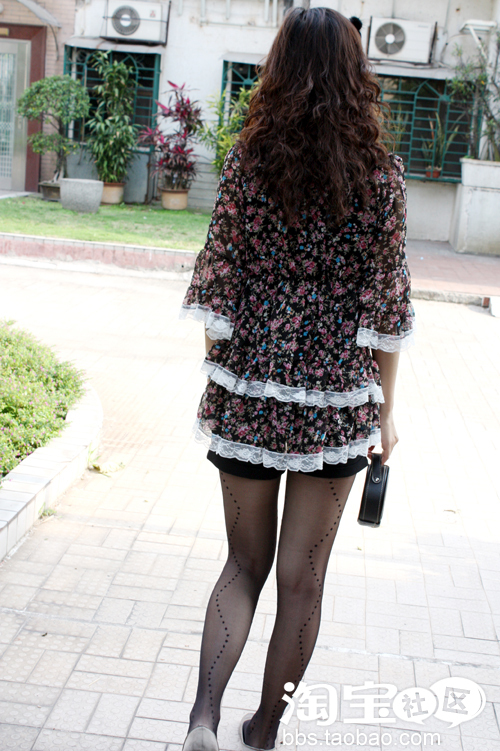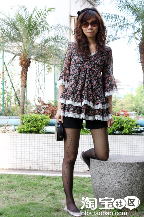 3、喇叭袖碎花蕾丝边雪纺衫+黑色短裤+丝袜