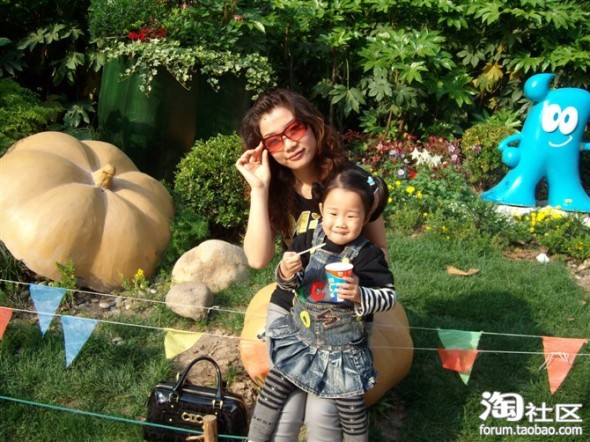 走得累了,坐这歇会!南瓜模型给我当凳,我的双腿给宝贝你当凳!