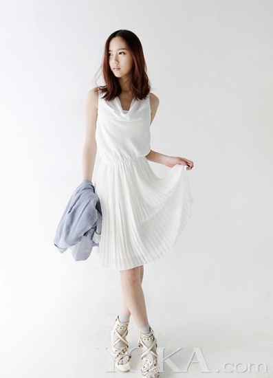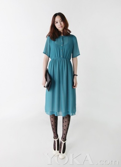 湖蓝色雪纺材质连衣裙,稍稍高腰的松紧设计拉长下身比例,上身内搭吊带,若隐若现的效果让女人味十足,过膝的长度搭配黑色圆点丝袜和白色高跟鞋,丁字的设计复古怀旧,让气质更加的优雅。