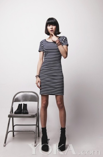 海魂风格的条纹,略带休闲感的短袖连衣裙,贴身的款式具有一定的修身效果,圆领的包边和手腕的配饰看起来非常精致,搭配黑色高跟鞋和着袜的穿着相当出位!