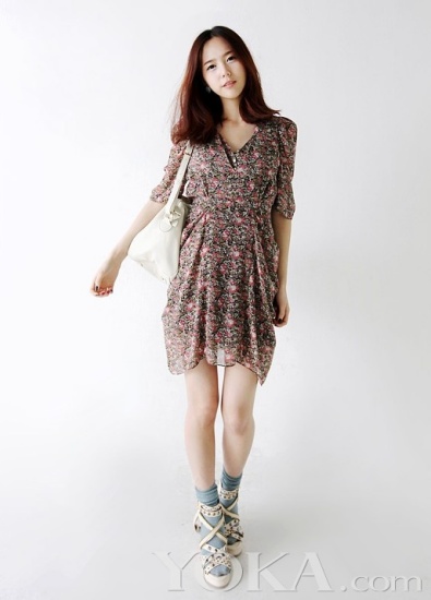 满满的小碎花,经典的田园风格。肩部的褶皱设计让腰部看起来更加纤薄,下摆的层次堆积感,可爱十分,搭配白色肩包和柳丁罗马鞋,着袜看起来清新自然!