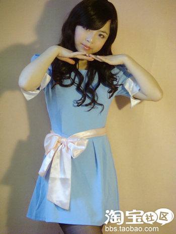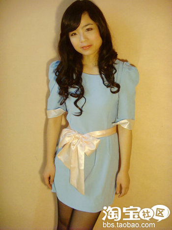第六款 梦幻蓝 粉色绸缎 腰带 泡泡袖连衣裙