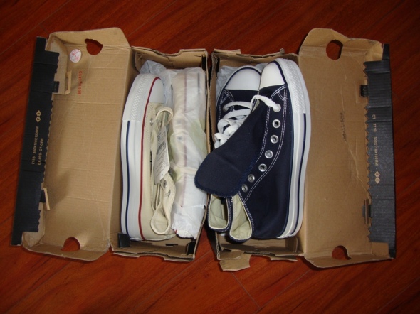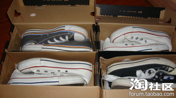我最爱的匡威~~~一共六双~~前四双是去年买的~~后两双是新买的~全部60多!我不会看真假~店主店里有对比图~不过专柜都要卖200多,而我只要质量很好,穿的住,我就当它是真地~~反正咱也不是有钱银~~追求不起牌子呀~~只是有点小问题,我穿匡威穿36.5码的,店家半码的很少,前四双我买的36的,感觉有点挤~~后面两双买的37又太大~~垫了两副鞋垫才合适~~真纠结~~~
