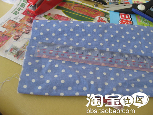 把布对摺,用尺量好要裁剪的部分。