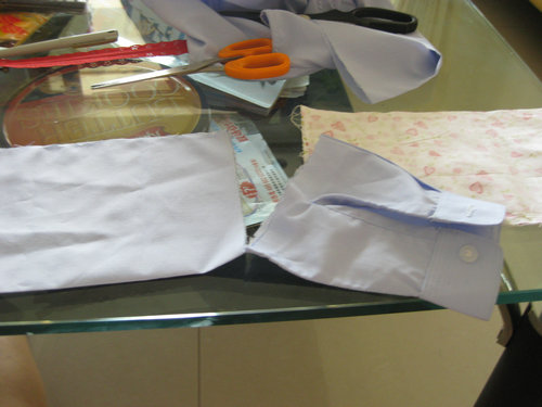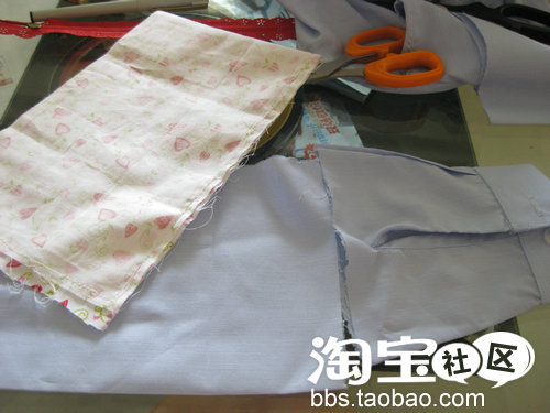 你看我缝出来的手工也不错嘛~呵呵。。。实习完毕之后就正式开工哦~~!~!加油!这次要准备DIY的材料是以前的浅蓝色工作服一件(其实只要袖子而已,剩下的部分下次再用)、可爱田园小布碎一块(上次妈妈帮我缝手袖时剩下的)、欧式复古拉链(自己批回来用的)