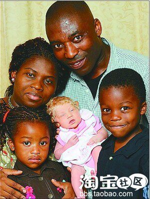 5年前,本杰明和安吉拉夫妇从非洲移民英国,目前居住在伦敦东部的伍尔维奇市。不久前,夫妇俩喜得他们的第三个孩子———女儿纳玛奇,她天生皮肤雪白,长着一头长长的金色卷发和一双漂亮的蓝眼睛。夫妻两人都惊呆了,不敢相信这是他们的女儿。