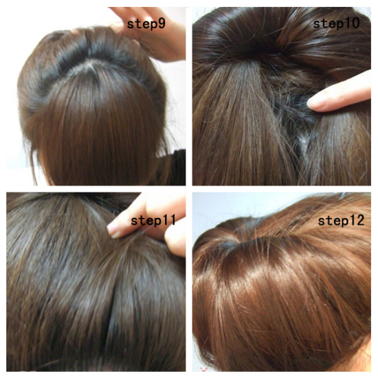 把头发高高的梳起一个马尾,并握起一个拳头大的发箍,用皮筋固定,然后把马尾上的头顶中间部分的头发挖一个小洞。