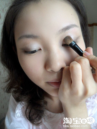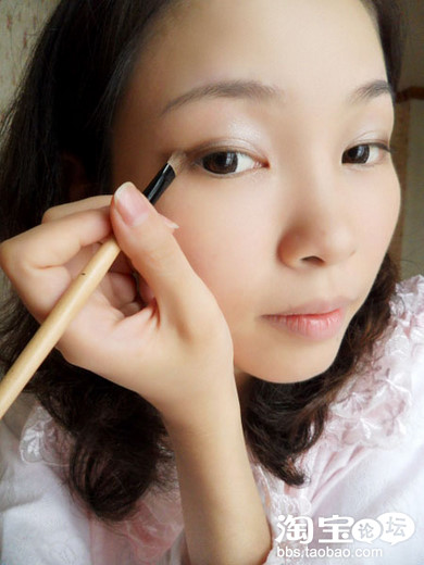 然后用中号眼影刷沾取米白色,沿眼窝范围刷在眼皮前半部分,与褐色的部分相结合。