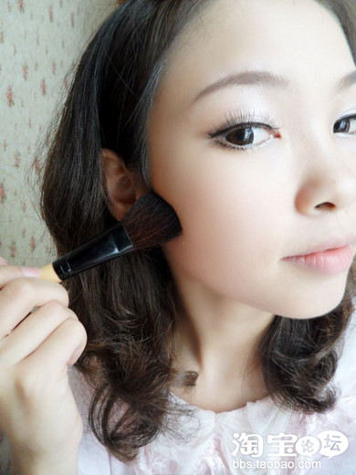 然后沾取腮红橙色,斜斜打在颧骨上