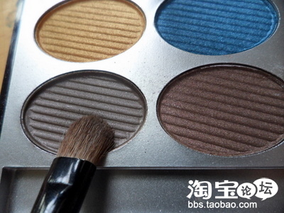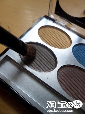 再用小号眼影刷沾取蒙巴拉眼影中的深褐色,在眼睛1/2处向后扫,范围不要超过双眼皮,眼尾处扫出微微上翘的效果。