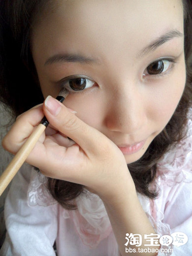 第二步,再用小号眼影刷沾取一些深褐色眼影,眼睫毛根部刷在下眼皮后半部分。