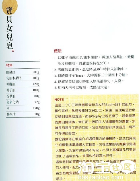 这些是准备工作工具,然后准备做的第一块手工冷制皂是(今天起,爱上手工皂)书里提到的宝贝女儿皂,为什么选这款皂呢,是因为肚子里有即将出世的宝宝,虽然B超是男孩,但纯天然无害的皂皂当然一样适用.加上先生的皮肤属于干燥敏感型,所以第一个试验品就选这个配方啦.这里特别附上配方,有兴趣的JMS也可以试制一下.