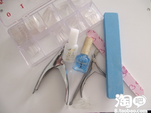 首先大家要准备的工具是:全贴甲片,胶水,砂条,抛光条,营养油,指皮软化剂,钢推,死皮剪,“一”字剪。这些都是贴甲片必备工具哦~~MM们可以跟自己贴,也可以跟别人贴哦~~