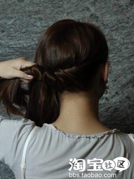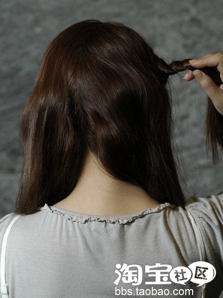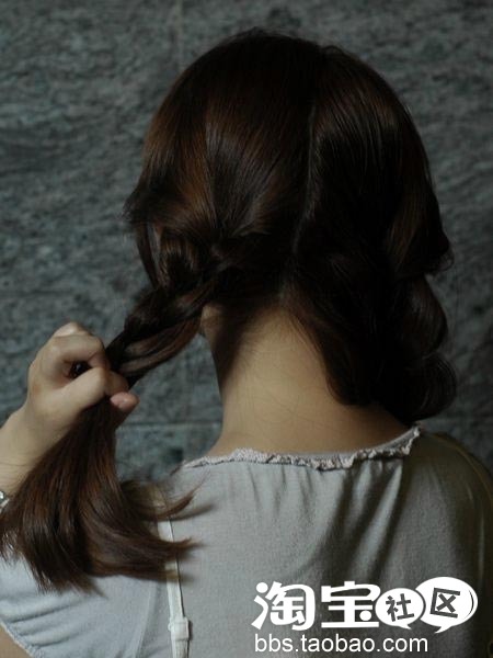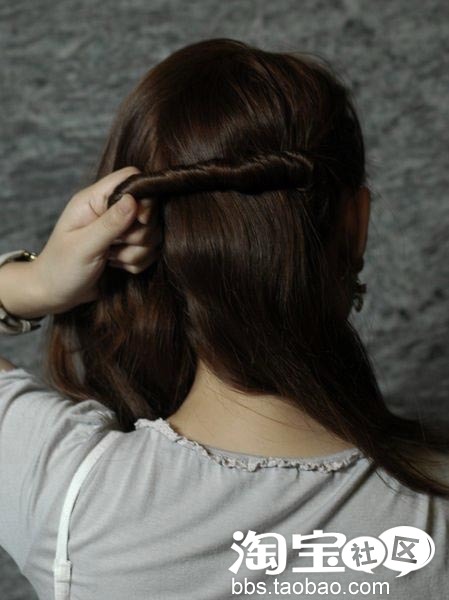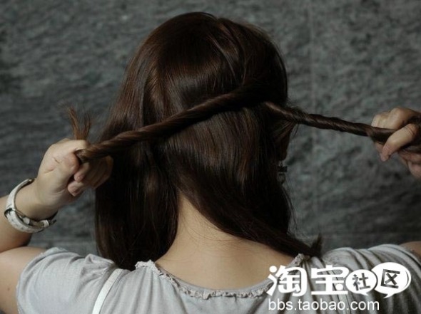 第二步:将揪起的一束头发向上,往内侧扭啊扭,不用扭到头,扭到三分之一处就好。