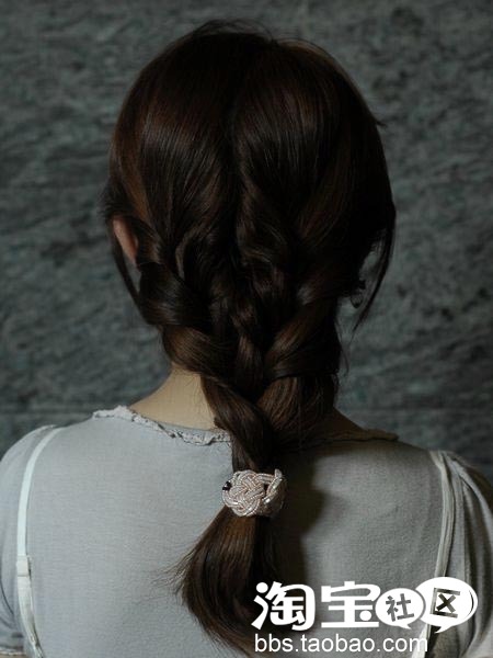 第五步:用同样的方法继续分出剩余的发束,偶一共分了四束,最后开始分出的发量多的一部分头发就全部扭好啦!