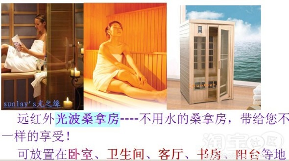 sunlays光之缘光波浴房是当今风靡于欧美的第三代沐浴保健设备。它以5.6-15微米的远红外线为主要能量,集世界流行的低温出汗技术、光按摩技术和安全的日光浴技术于一身,使人们在沐浴的同时享受轻松的音乐,对人体有着良好的保健作用,是传统桑拿浴的替代产品。
