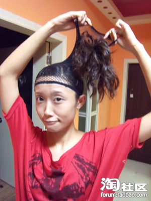 2。把发网从头顶往下套。