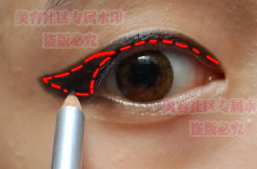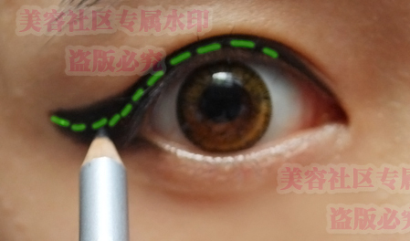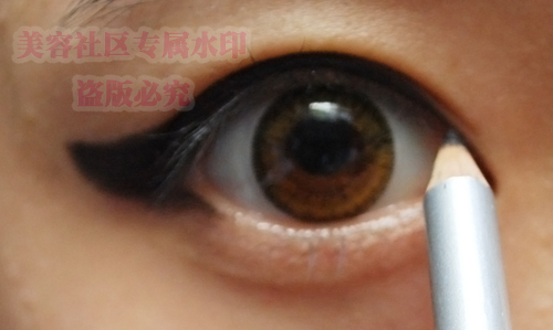 接下来让眼睛更有神!用1号眼线笔,来勾勒出我们要完成的眼睛的大概轮廓。方向如图所示,先向上,然后向下。